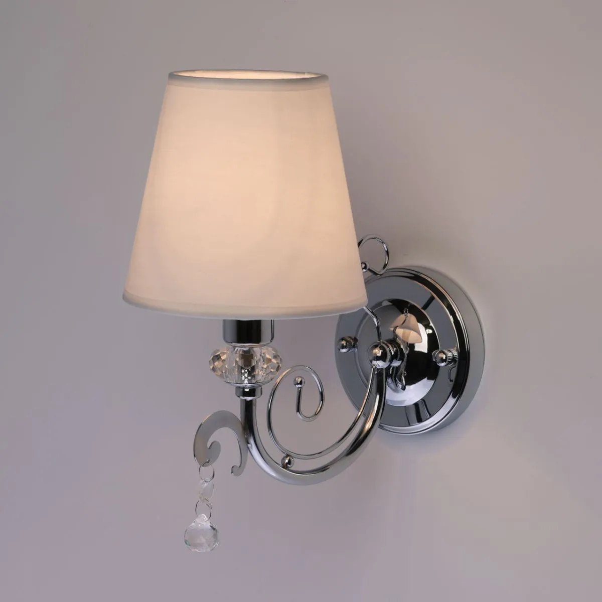 Основание/ металл/ хром Абажур/ текстиль, акрил/ белый, прозрачный Декор/ хрусталь/ прозрачный